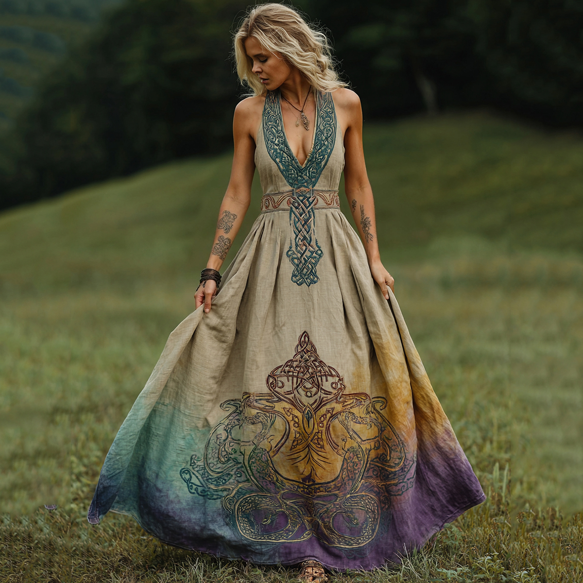Women's Celtic Knot Ombre V-neck Belted Maxi Dress