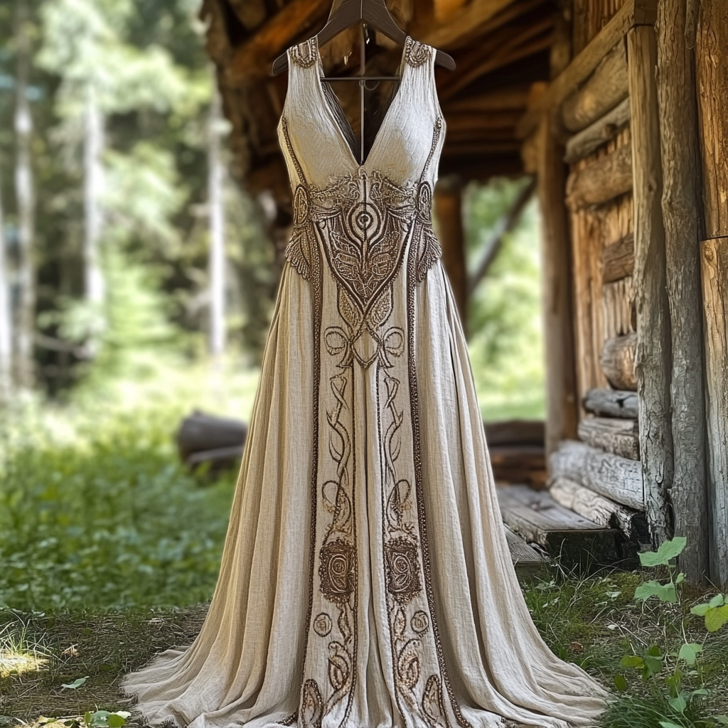Women's Vintage Viking Rune Cotton And Linen Sleeveless Large Skirt Dress