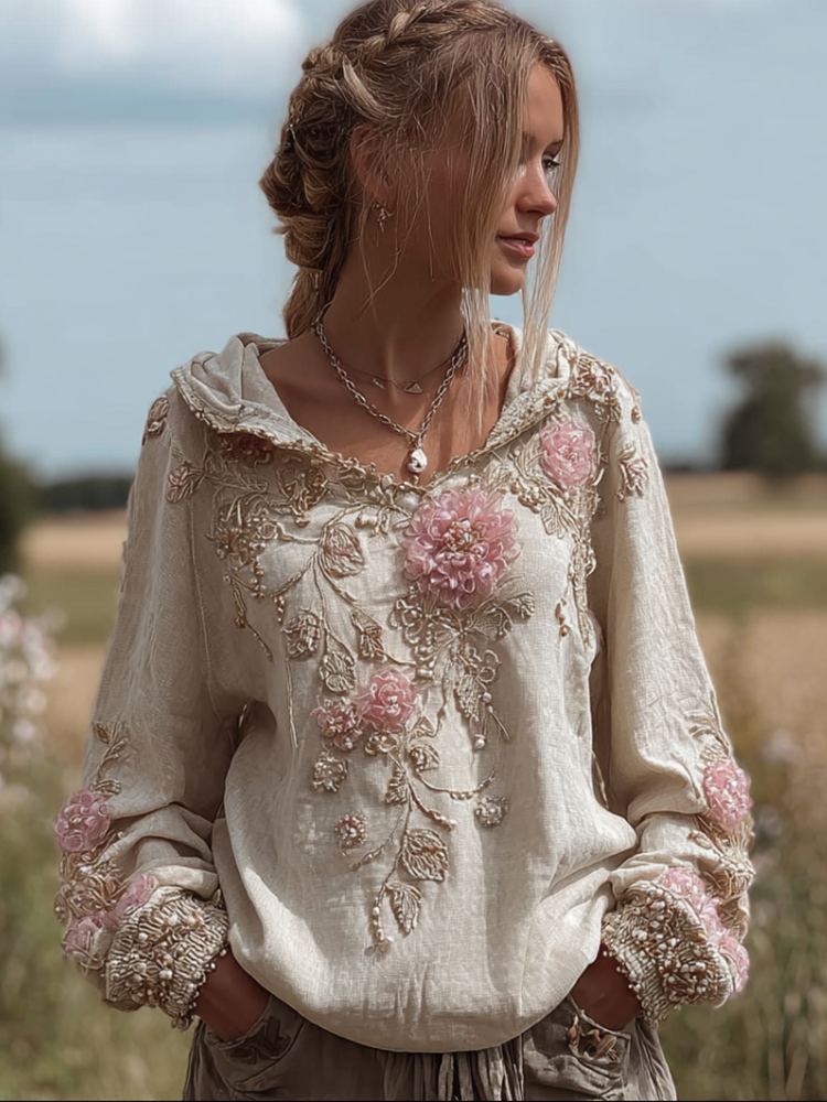 Bohemian Style 3d Pink Flower Embroidery Pattern Women's Hooded Long-sleeve Sweatshirt