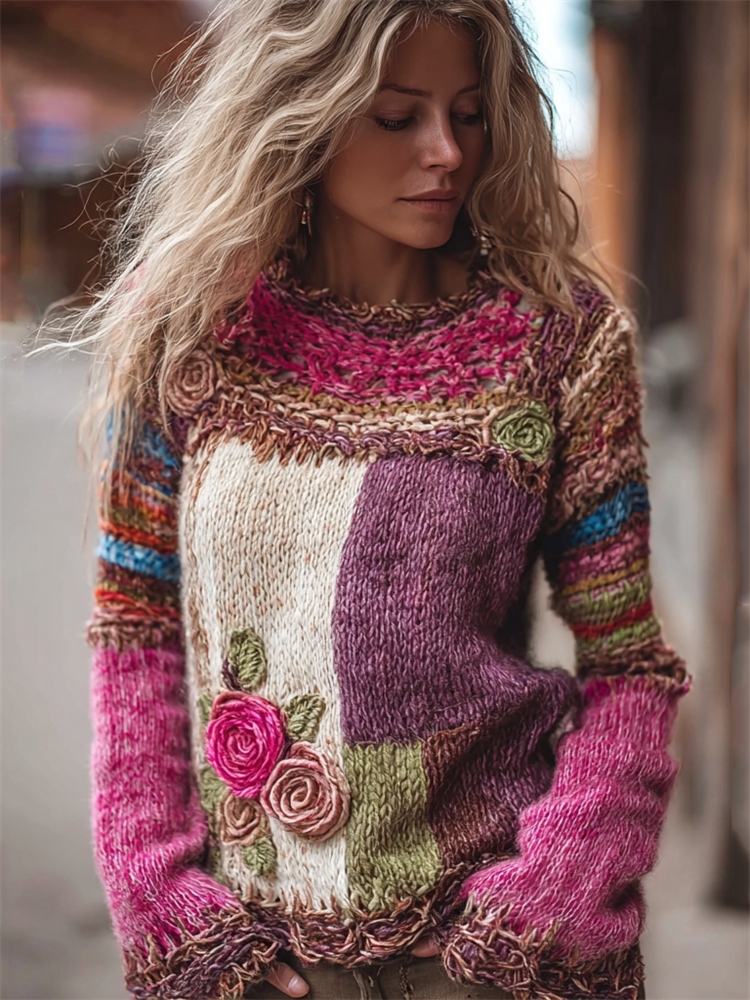 Boho Roses Crochet Colorblock Cozy Knit Sweater