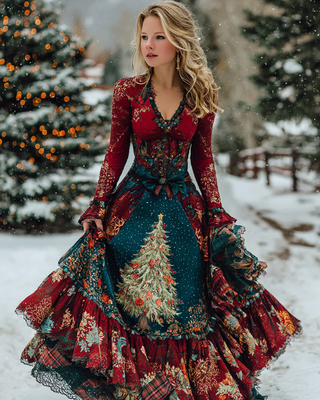 Christmas Themed Contrast Color Christmas Tree Embroidered Dress 2737