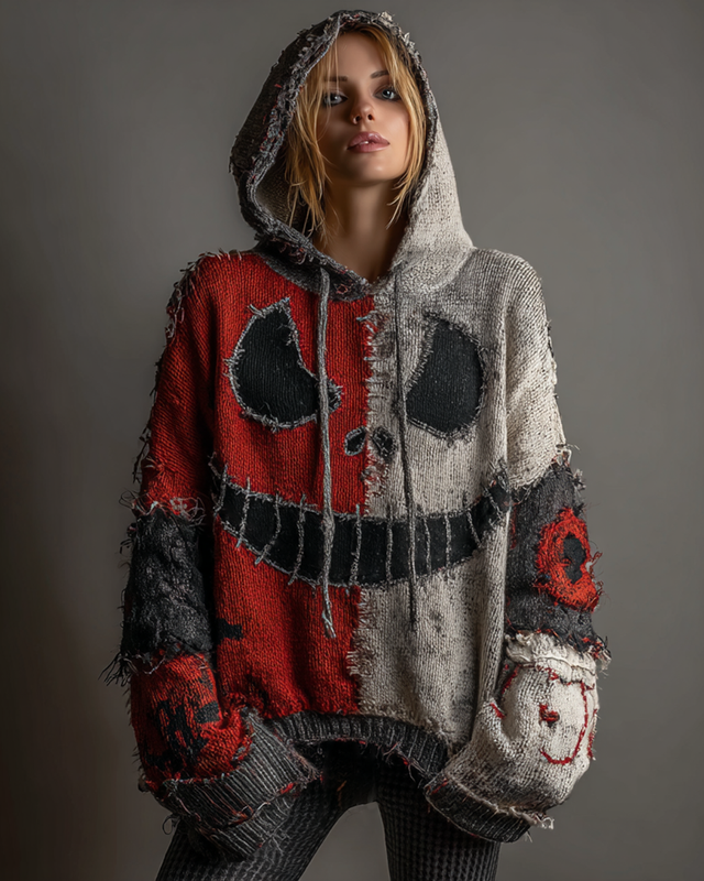 Halloween Spooky Face Patchwork Stitched Cozy Knit Hooded 4c42
