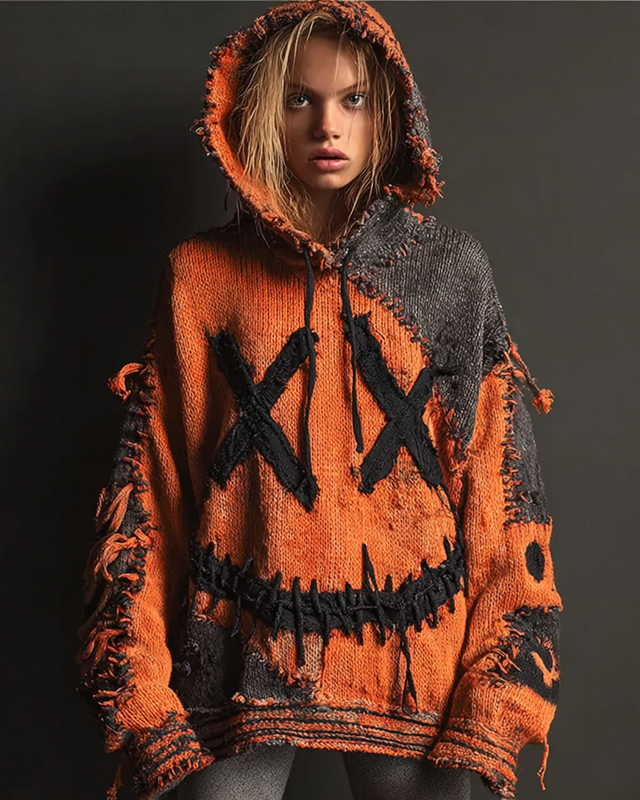 Halloween Spooky Face Patchwork Stitched Cozy Knit Hooded 60c4