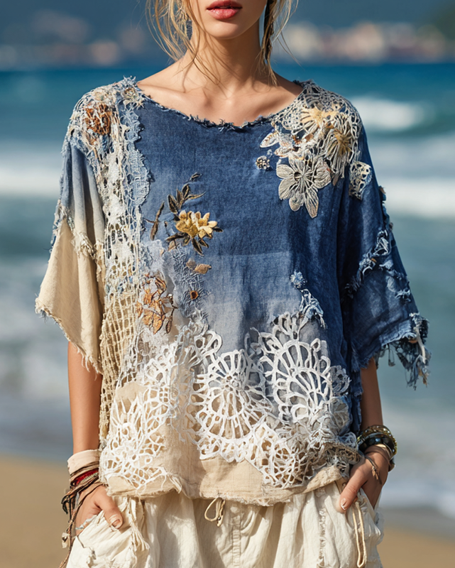 Summer Vacation Lace Handmade Floral Embroidery Top 56b6