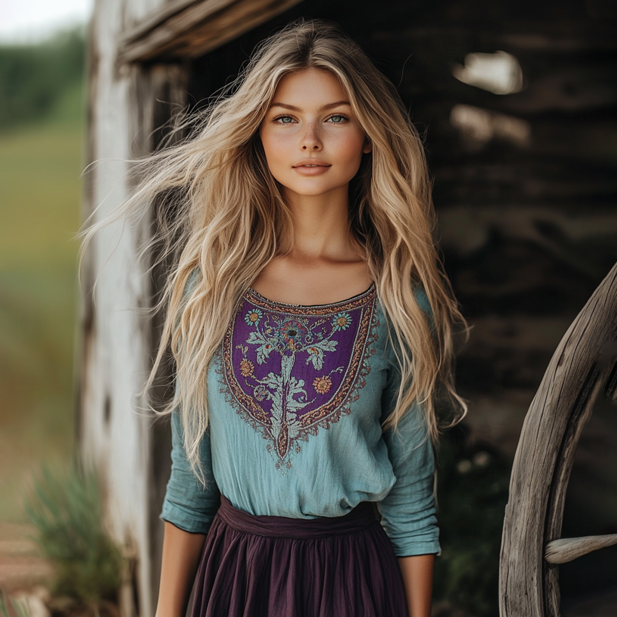 Vintage Floral Tribal Embroidery Art Linen Blend Crew Neck T-shirt