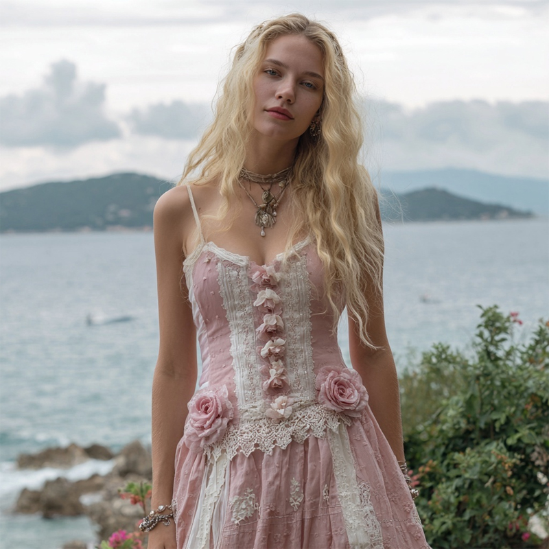 Vintage Pink Roses Embroidered Lace Patchwork Linen Cami Dress