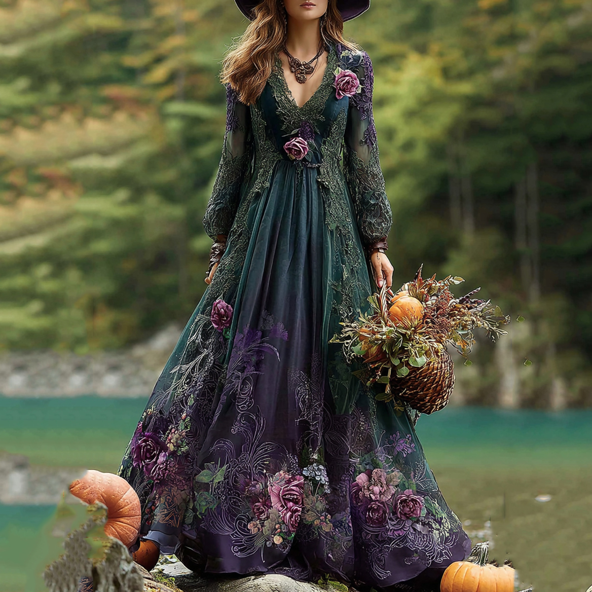 Vintage Purple Floral Pattern Linen V Neck Long Sleeve Maxi Dress