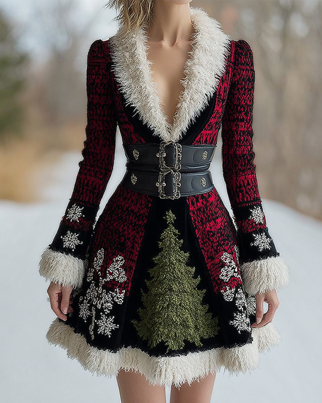 Christmas-themed contrasting-color snowflake Christmas tree embroidered frayed knit dress 11ee