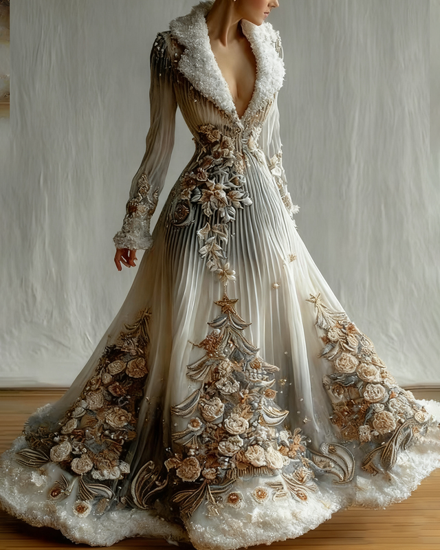 Women's Christmas-Themed Beaded Embroidered Fur- Collar Dress 3164