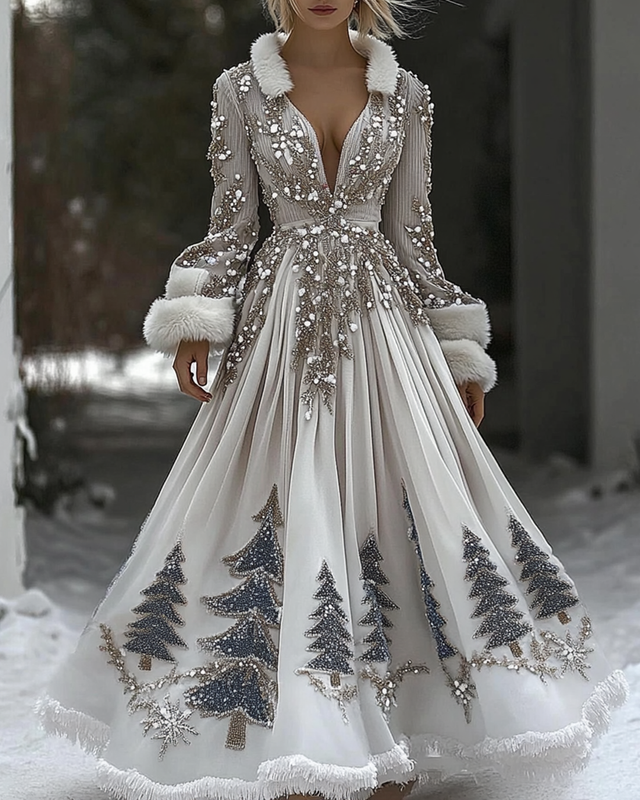 Christmas-Themed Gradient Snowflake Beaded Christmas Tree Embroidered Fur Collar Dress 6710