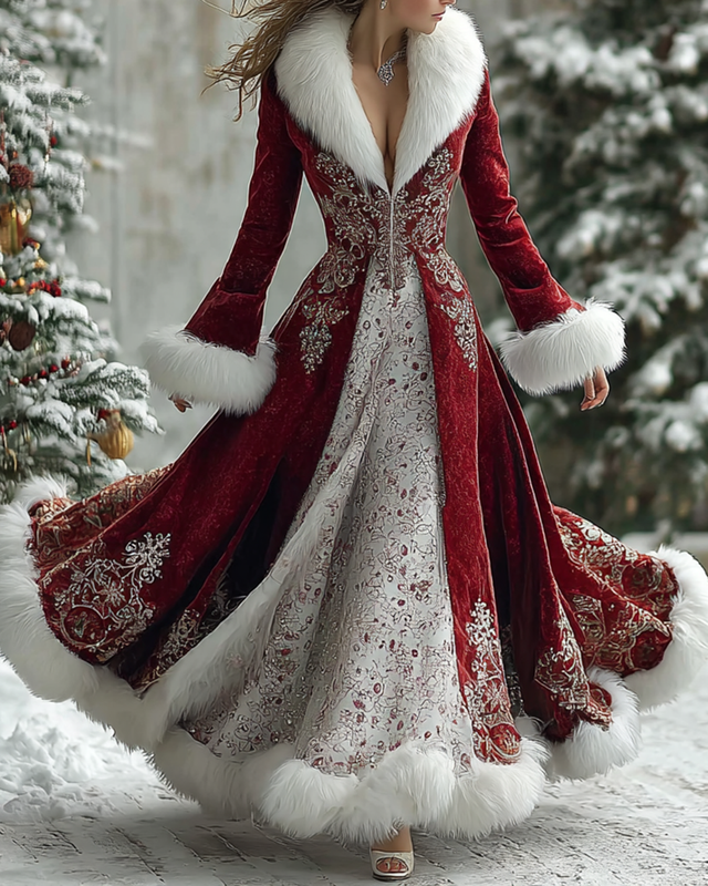 Christmas-Themed Contrast-Color Snowflake Beaded Embroidered Fur- Collar Dress 8073