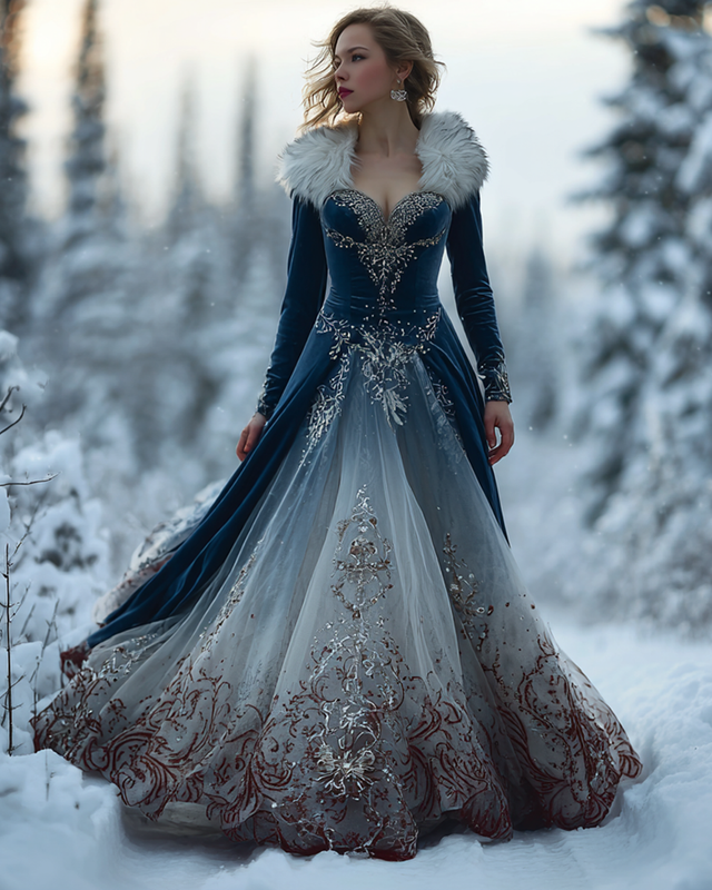 Women's Autumn/Winter Christmas-Themed Embroidered Original Design Fur Collar Patchwork Dress 9450