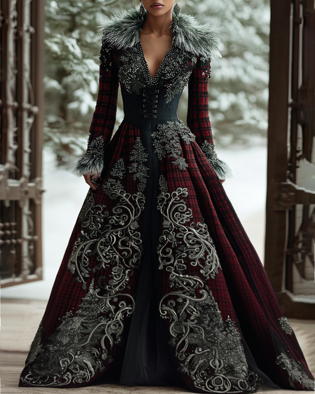 Women's Christmas-Themed Plaid Patchwork Christmas Tree Beaded Embroidered Dress