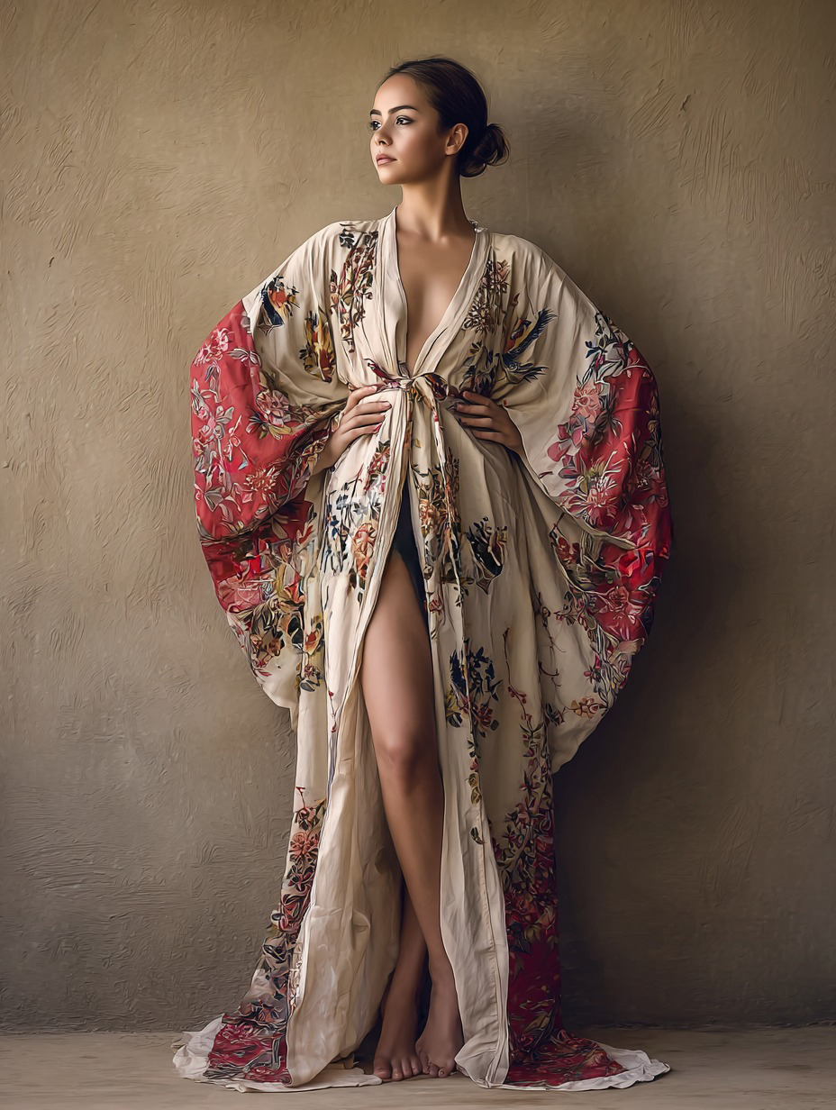 Women's Classical Flower Kimono Linen Robe (Including Belt)
