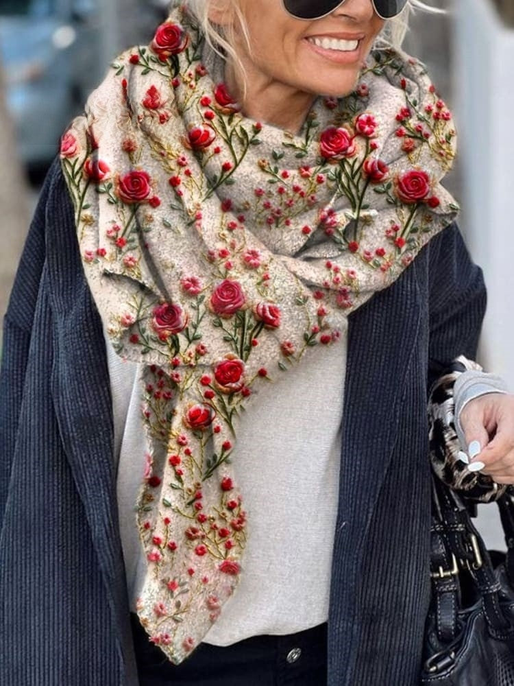 Women's Flower Print Casual Knitted Blanket Poncho Hood Cape