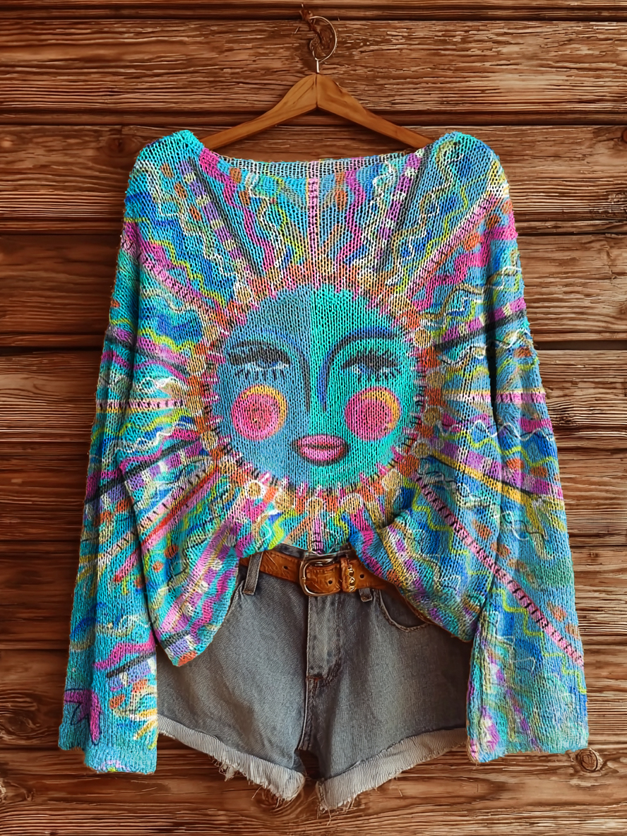Women's Hippie Sunfloral Art Print Casual Pullover Sweater