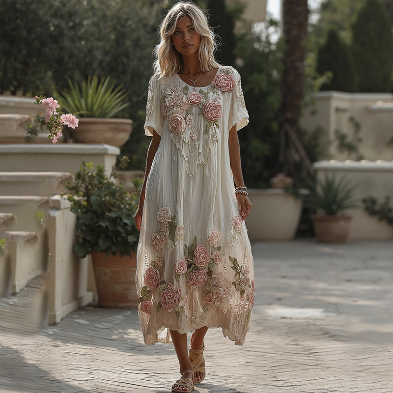 Women's Vintage Pink Rose Gradient Pattern Linen Crew Neck Dress